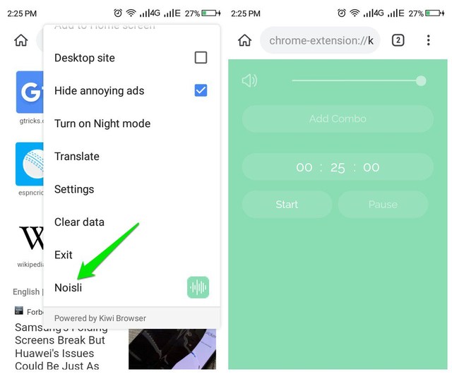 Comme décrit ci-dessus, Google Chrome fourni avec les téléphones Android ne permet pas l’installation d’extensions. Donc, pour accomplir cette tâche, vous devrez vous procurer un autre navigateur, basé sur Chrome, appelé Navigateur Kiwi.